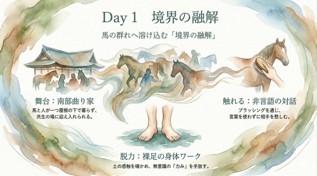 馬場のふかふかの土の上で裸足になり、身体の感覚を確かめ、自覚のない「力み」に気付く。 - 馬との初期的コンタクト