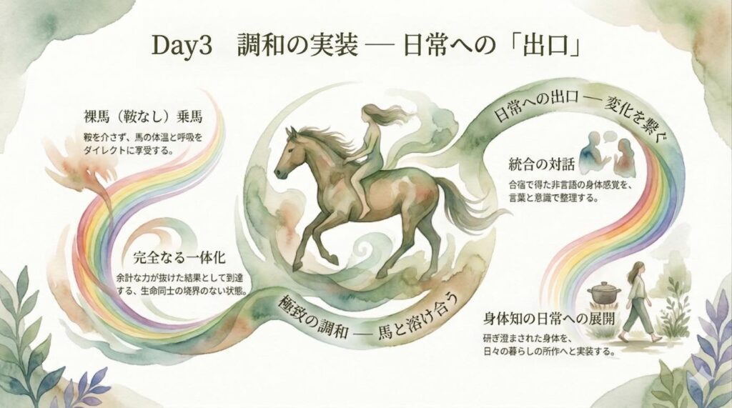 三日間のワークを経て余計な力が抜けた結果、鞍を使わず馬の体温や呼吸を直接享受し、一体化する境地に達します。 - 統合の対話